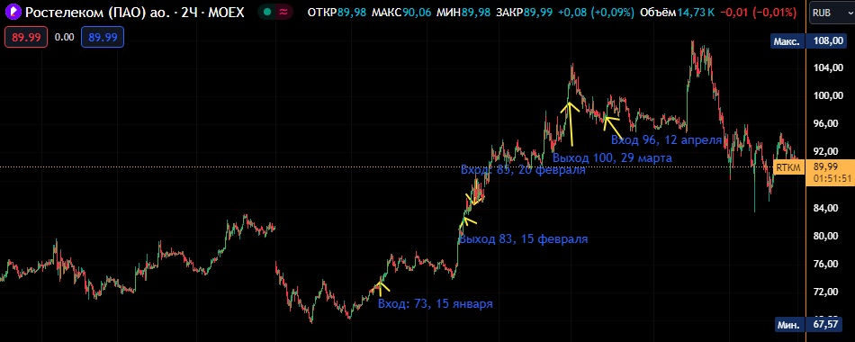 Здравствуйте, коллеги! Обрадовался я, что Ростелеком вырос до 96, но не тут-то было! Снова откатился до прежней цены 90