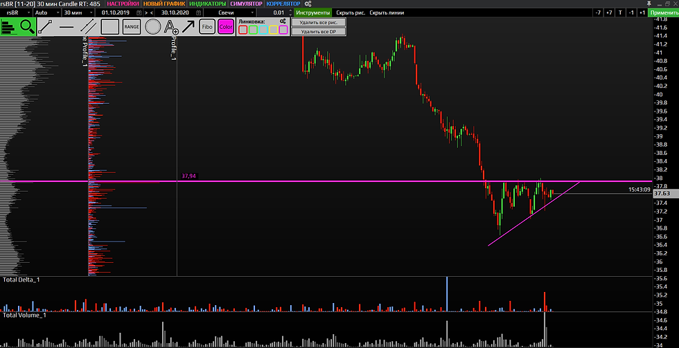 Коллеги, в нефти вымпел и выход вниз или пробьем сопротивление на 38-38,8? на красной свече с длинной тенью снизу с отскоком объем повысился